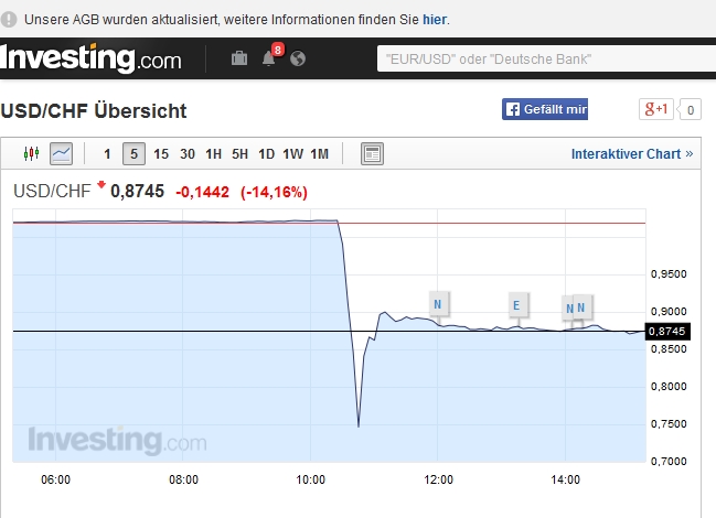/edit: geiles Chart jetzt..überschwingen und Dämpfung.. vermutlich wurde die Bindung von CHF an EUR nicht aufgegeben, sondern "umgekoppelt" an den Dollar.. seit 12:30 ist es ja wieder unnatürlich stabil :glaskugel: