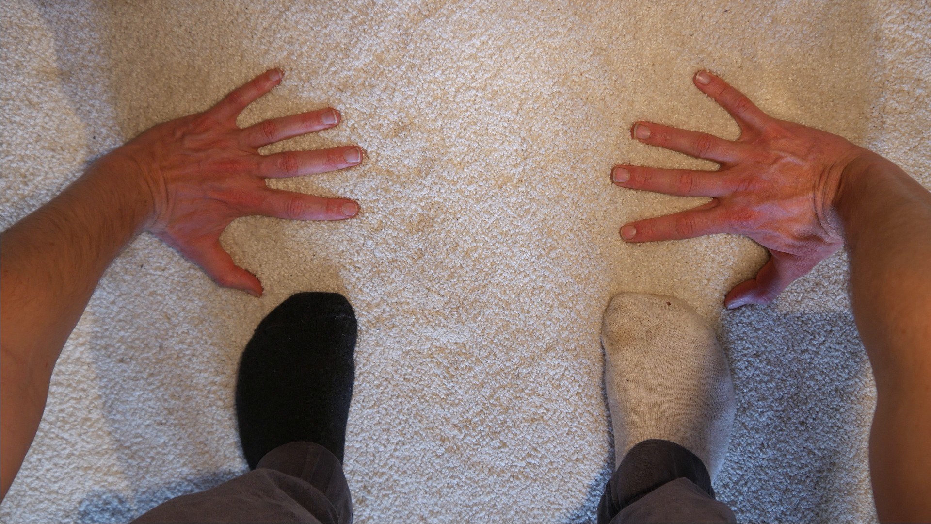 Nach meiner Psychedelic QiGong Meditations Praktik fiel ich vorne über und breitete meine Hände vor meinen Füßen aus, die in je einer Weiße und Schwarze Socke gepackt waren. Dieses Bild war so schön, das es in mir das Bedürfnis ausgelöst hat es zu Fotografieren. Das geschah dann am nächsten Morgen. Da griff ich zur Kamera und übte mich nach dem Aufstehen etwa 1 Stunde lang in Vorbeugen, bis ich es hinbekommen habe, das so aussehen zu lassen, wie wenn ihr selbst diese Sicht habt. Das war eine sehr schöne Yoga Praktik am frühen Morgen.